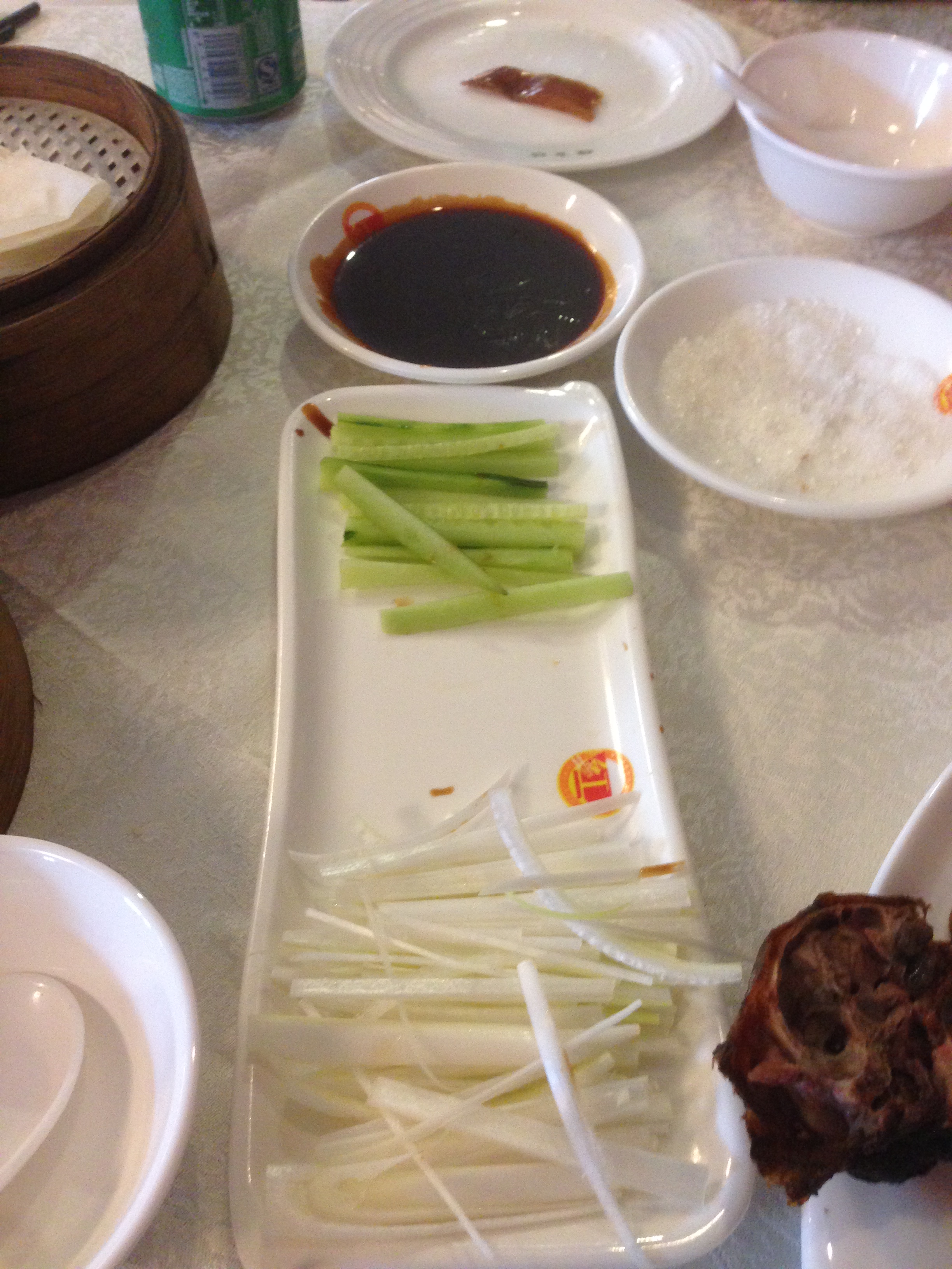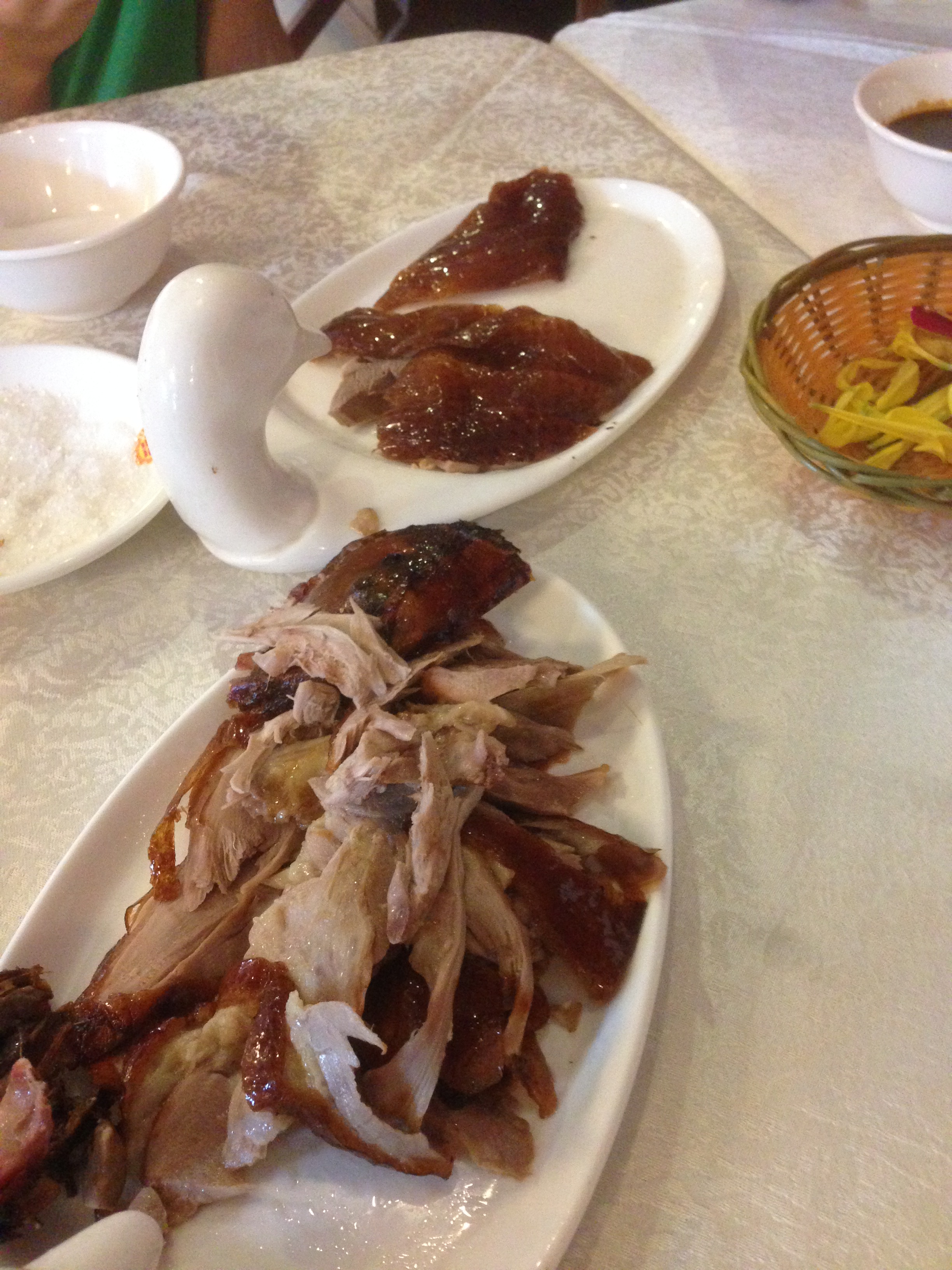 The hostess was very kind and didn’t even turn down her nose at us but led us to a nice big table in the dining room. We then received a menu, with not an English word or Roman letter on it anywhere. We were too hungry to give up now though! I told Clay that according to my reading it was considered OK to look at what other people were eating and to motion that we would like what they have. He didn’t feel we were quite that desperate yet, however, and decided we should refer to the pictures in our menu. There was a nice picture inside the cover of a duck with some wraps, cucumber, and a few other things. We motioned for a waiter to come over and showed him this page, pointed to the four of us, and hoped for the best.