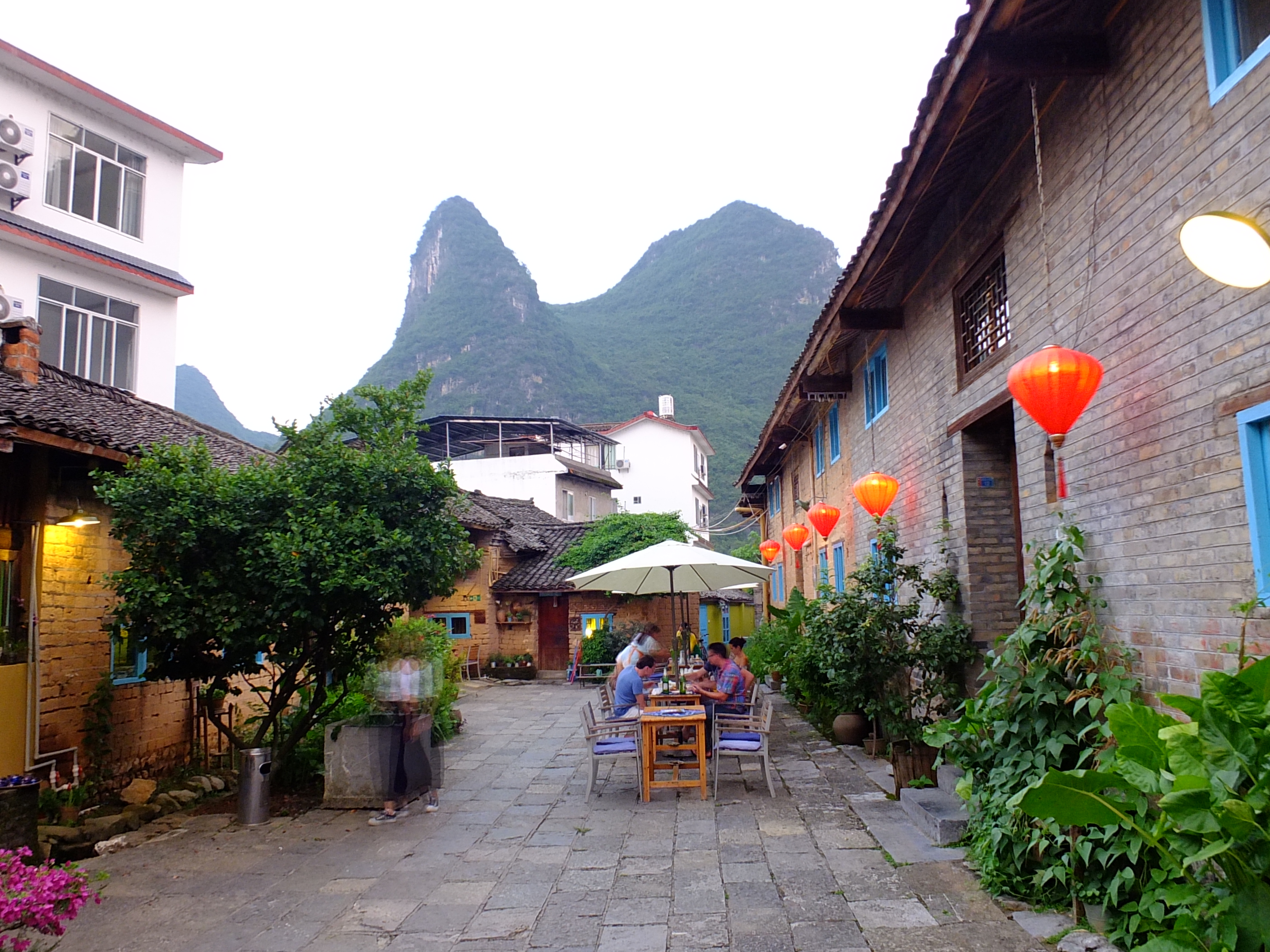 The hostel is set about 2km outside of the town of Yangshuo so you have to walk or rent a bicycle to get there. We walked there the first time and found a local eatery out on the street of this trendy restaurant alley. We were told that one end was very touristy with expensive Western-style (i.e., North American) food and the other end was much cheaper and had local fare. Well we walked the row and decided on a local menu, primarily because it had pictures of the dishes they were offering and we could just point to the ones we wanted. Barb and the boys ordered steamed pork dumplings and I had the “outer covering intestine beef noodle”. I know it doesn’t sound that appealing but it tasted great – a little spicy – but great.