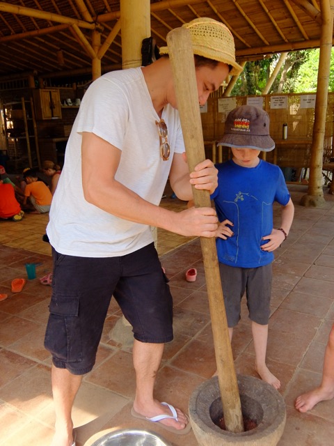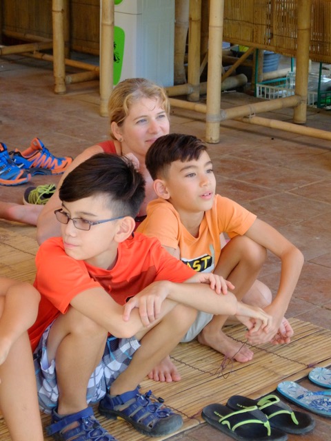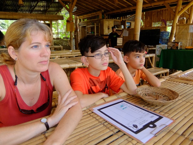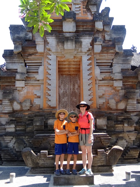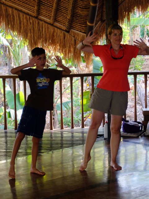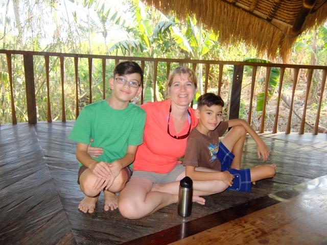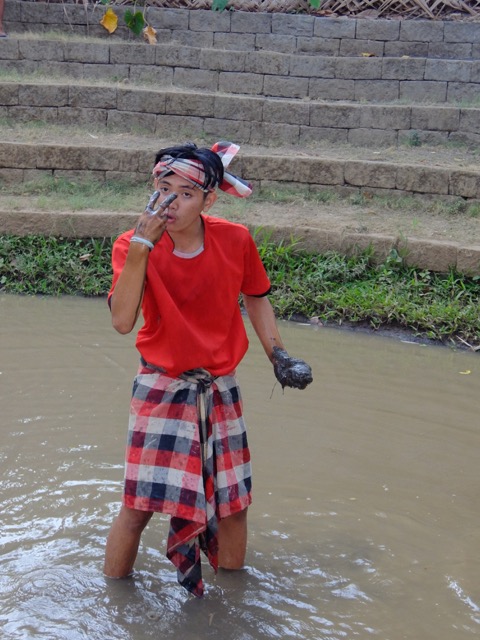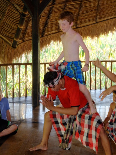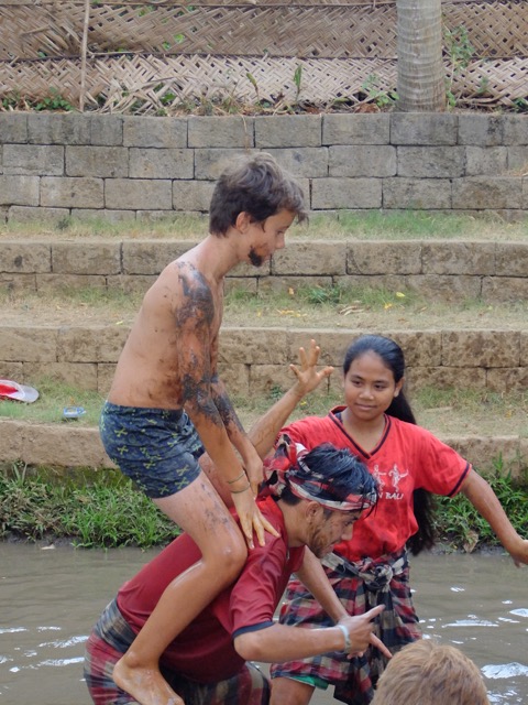 There was no time for a break – it was on to the Balinese martial art of Mepantigan, or mud wrestling. We returned to the yoga studio to learn the different moves that are used, and the corresponding calls. Then it was off to the mud wrestling pit! A large vat is filled with mud and everyone steps in. The leaders call out the directions and everyone follows along. Soon people are being flipped into the mud, here there and everywhere! Our boys decided to stick to the observation deck, along with Clay and I. We already spent a week getting the mud out of our bathing suits after our last mud bath experience!