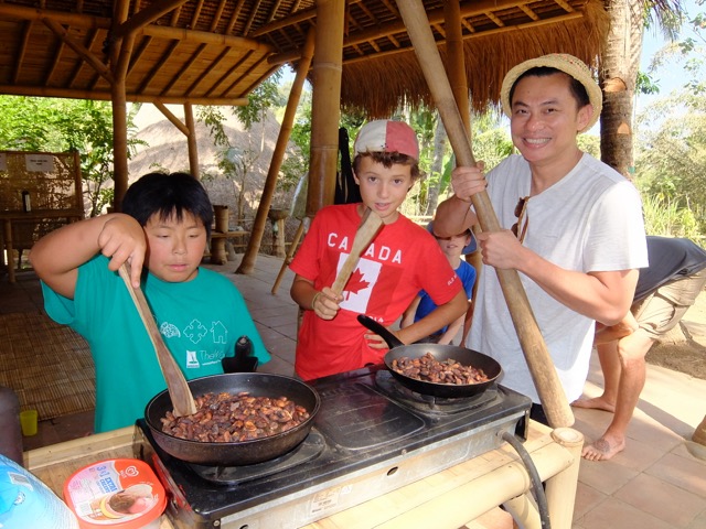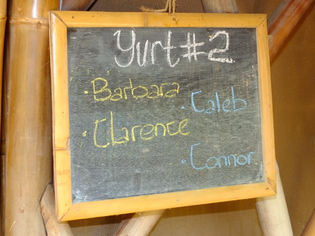 We pulled into the rut-filled dirt parking lot beside a hand painted sign that read “Green Camp”. We were met by a camp guide who showed us to our “cabin”. It was constructed of bamboo with a high ceiling so the heat could escape, similar to the design of a yurt. There were 3 sets of bunk beds in the cabin and a bamboo shelf. We proceeded to unpack and then met our guide for our introduction to Green Camp. He explained the grounds and how to use the compost toilets. Having traveled for 3 months, with a variety of toilet styles, having to use one toilet for pee and another one for “the other” followed by a sprinkling of saw dust, did not phase us!