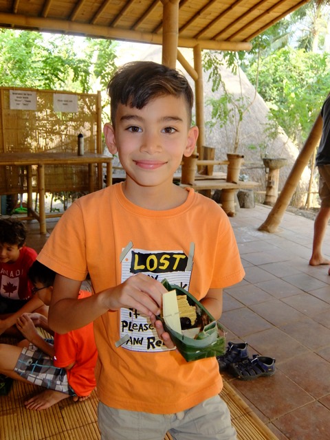 Next was the family egg drop competition. Each family was given an egg and 5 minutes to find natural materials off the ground and create something that would prevent the egg from breaking when thrown from a tree top. Connor spotted a Jack Fruit and we were able to dig out a section, put our egg in, and then fill the hole with leaves. Fortunately, when the jack fruit was thrown by our guide, from the top of the nearby tree, despite rolling for several feet into a ditch, it managed to survive unscathed!
