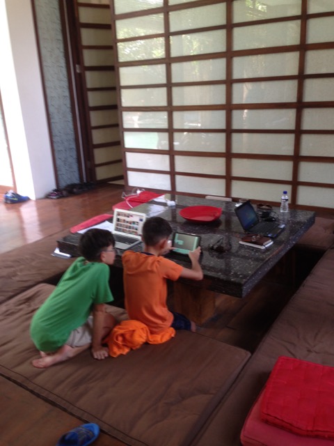 Walking into the villa was incredible. The main floor is built around a swimming pool, with natural rocks and greenery jutting out from the edges. There are two bedrooms on the main floor – where Clay and the boys would be staying. The eating area was built into the floor – Japanese style. The second floor had two more bedrooms and a very large sitting area. The rooftop had another sitting area and also looked down onto the pool. There are many times on this trip that people have told the boys how lucky they are, and the boys look at them as if to say, “I don’t always feel that lucky!” but we all knew how lucky we were to be staying here!