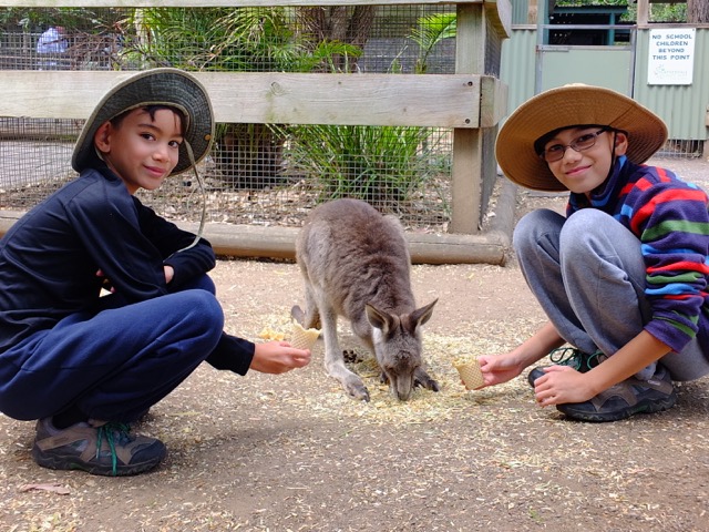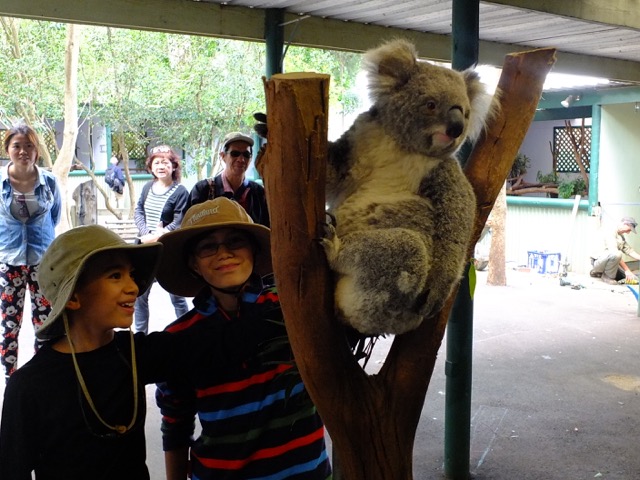 Featherdale was animal heaven for the boys! There were large areas where the wombats and kangaroos hopped around freely and the boys could pet and feed them. You could pet the koalas and get your photo taken (for free!) beside one. We spent several hours visiting the various Australian animals until our brains were saturated with animal information and we couldn’t cram in any more!