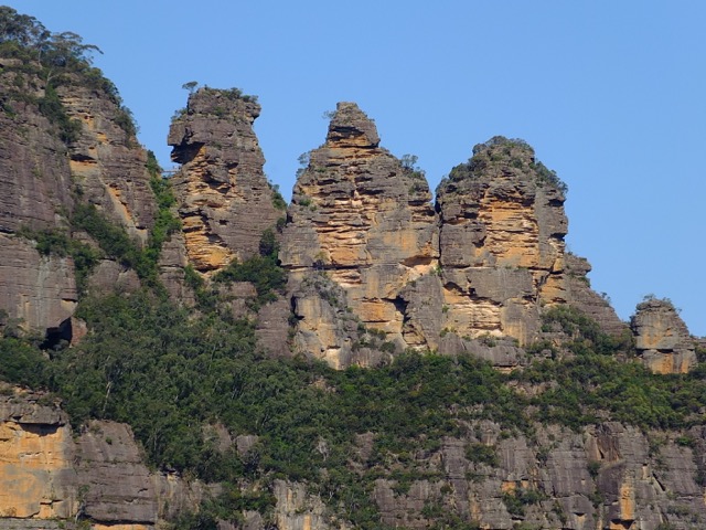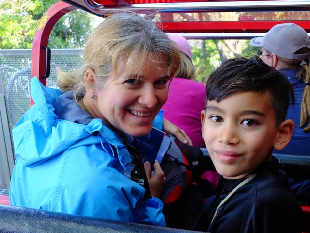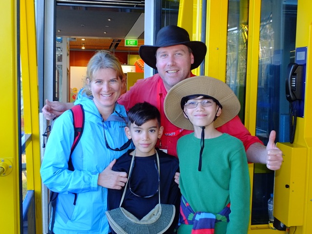 Once at the bottom, we disembarked and headed down the boardwalk. We ran into a large group of Asian tourists and managed to weave our way through them so we could move at a good clip through the rainforest. It was beautiful! We wished we had more time. No time to stop and read the information placards….no time to stop at the mining display……We arrived at the cable car and waited for the next car to pull up for us to board. With a capacity for 84 passengers, the Cableway is the steepest and largest aerial cable car in the Southern Hemisphere. Just as the car arrived so did the Asian tour group so we all boarded together. Unfortunately it seemed no one in the group spoke English so when the guide began to explain the legends of the Three Sisters to us, they completely ignored him and continued talking. I looked at him empathetically. Being a teacher, there is nothing I find more irritating than when people talk over the person “in charge”. He seemed to notice my expression and came over and said, “I think I’ll just tell you the commentary!” So for the 545 m ascent I had my own personal guide! (Clay and the boys were huddled in another corner of the cable car taking photos.)