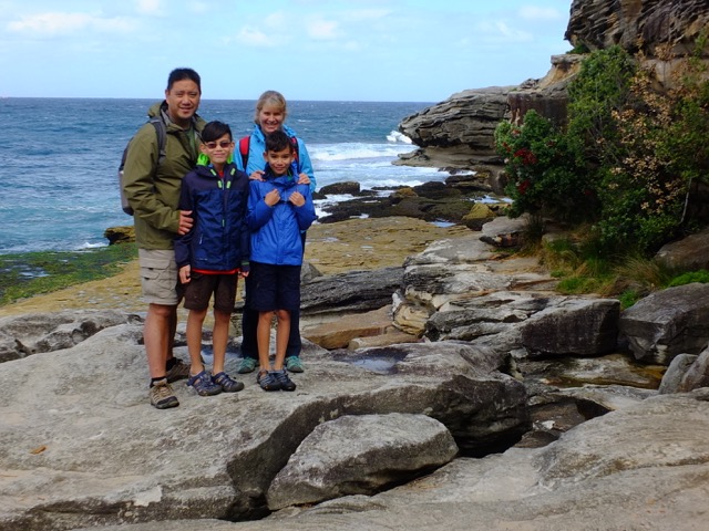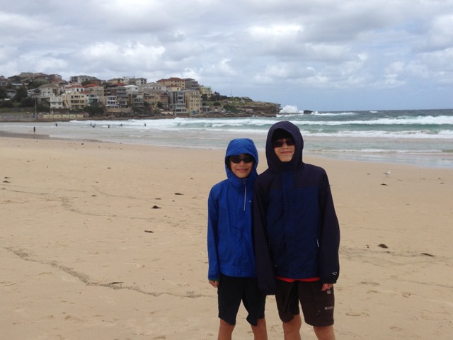 Although the weather was a little cool, on Tuesday we decided to do the famous Bondi shore walk. We ate our picnic lunch, huddled in a picnic shelter on the shore of Bondi beach and the boys spent an hour or so dodging waves, while still wearing sweaters and windbreakers! We then made our way along the shore from Bondi beach to Bronte beach. There were several art sculptures on display beside the shore and numerous benches so Clay’s parents could stop and take breaks along the way.