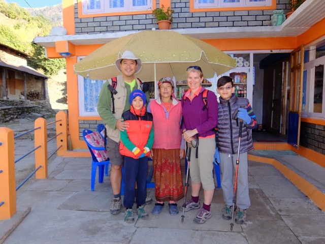 It started off as a mild incline with ramp-like roads but eventually gave way to steep stair-like steps. There were points when I felt like I was climbing a ladder but with a backpack on so I was huffing and puffing pretty much all day. I thought I was going to have a heart attack! By contrast, the boys seemed to be loving the experience and were scampering up and down the path ahead of us like a couple of mountain goats. Dhana would shake his head with a smile and say, “Too much energy”. Even worse (for me) was Barb who was right behind the boys like a mama alpaca watching over them. Whenever I asked Dhana how much farther the teahouse was his reply was always the same, “Just a few more minutes of walking”. *GROAN*