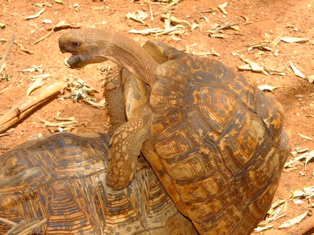 Later, we went to a presentation about the giraffes and learned a lot. On the way out of the centre we spotted a few giant tortoises. A pair of them happened to be making love right there in front of all of the other tortoises (and the visitors). They weren’t too shy about it! You can see them in the photo below.
