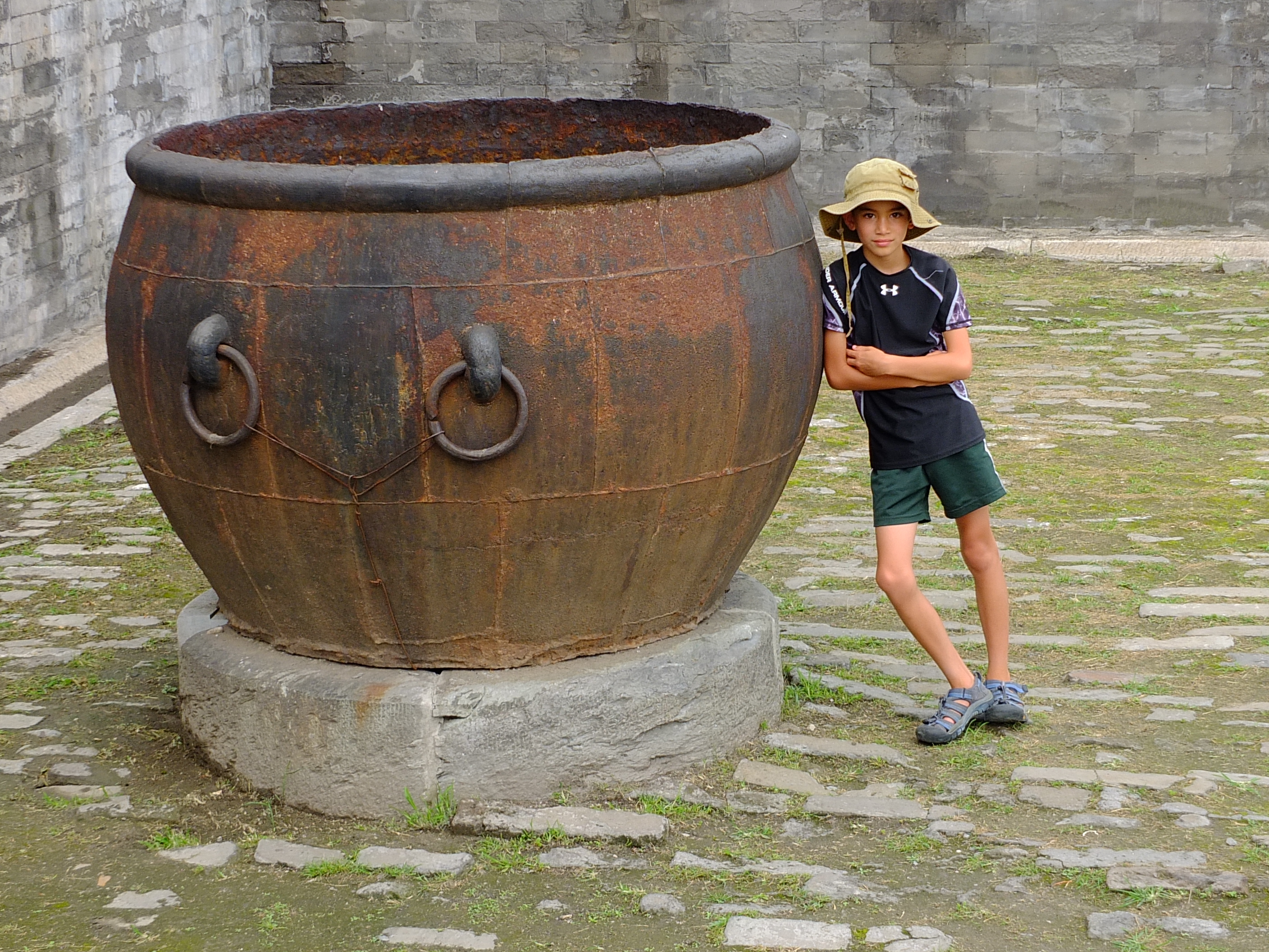 Today we decided to visit the Forbidden City. Thankfully we had already figured out the metro so we could save a little bit of walking by traveling a couple of subway stops and getting off right at the Forbidden City. When we came out of the metro, however, we were greeted with throngs of people who apparently were standing in line waiting to get in to the Forbidden City. I was a little annoyed that we hadn’t made it out of the apartment earlier to avoid the crowds but figured there was nothing we could do about it now. Of course, the temperature was already a nice balmy 37 degrees, with about 98% humidity so it was oh-so comfortable sandwiched between thousands of sweaty odoriferous people. I’m not sure how anyone thinks that it helps the line to move faster if they press themselves up against one another but that seems to be the norm. After 40 minutes squished in line, we finally went through a security scanner and came out into the open. We thought this was the entrance but it turned out we had to move into another line and go through another gate. Once ‘inside” we were told we needed to go to yet another line to get tickets. By this point Clay and the boys were looking a little wilted so I offered to stand in line to get the tickets while they waited under a tree. The line was, of course, out in the direct sun and moved at a snail’s pace. Again, people left next to no space between one another – making those of us who are used to a nice big circle of North American personal space, feel just a little uncomfortable. To add to the fun, the man behind me seemed to think it was a good time to “yell” at all of his buddies on his cellphone at top volume in Chinese. Then he would step up beside me in line, as though he might just be able to sneak past me at some point, if I didn’t seem to pay too close attention. Well, enough was enough, I gave him my “nasty” look and stepped out in front of him, and put my hands over my ears to show that I didn’t appreciate losing my hearing while waiting and burning to a nice crisp in the ticket line. I think he found this quite amusing and said something cheerfully to his wife and daughter. After 1 ½ hours we did finally manage to get tickets and enter the Forbidden City. Of course by this point we were very tired and hungry – I wonder how early we would have had to have been to be first in line?!